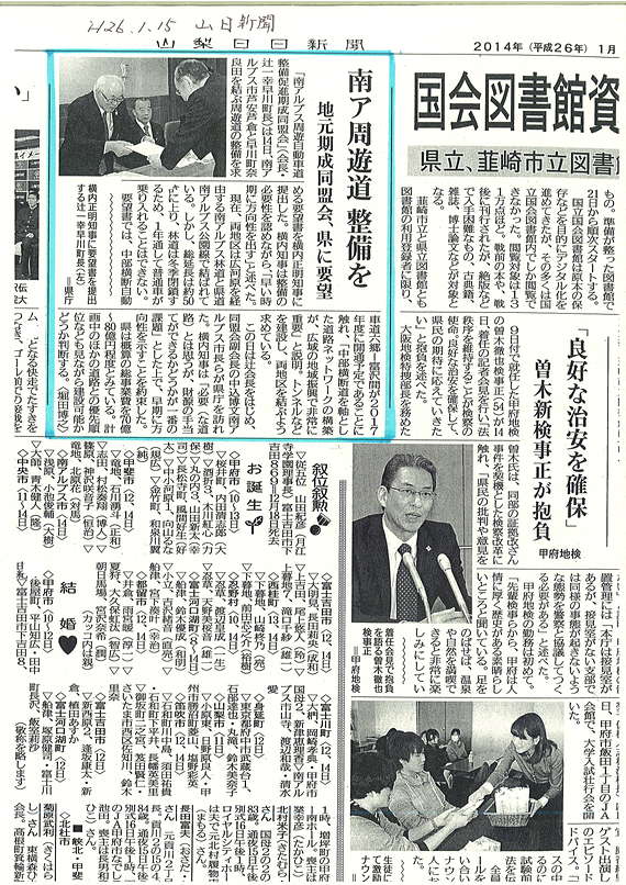 平成26年1月14日行われた要望活動について、1月15日の山梨日日新聞に記事が掲載されました。